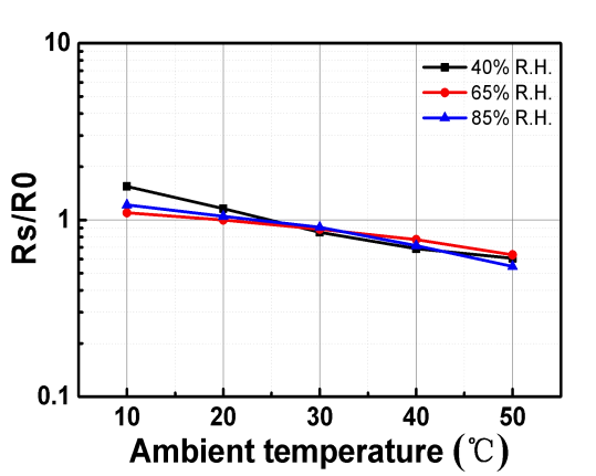 下图是在标准试验条件下的温湿度 特性曲线。纵坐标为不同温湿度下传感器电阻比(Rs/R0),横坐标为温度。Rs表示传感器在各种温湿度下清洁空气中的电阻值;R0表示传感器在清洁空气中,温/湿度为20°C/65%R.H.时的电阻值。